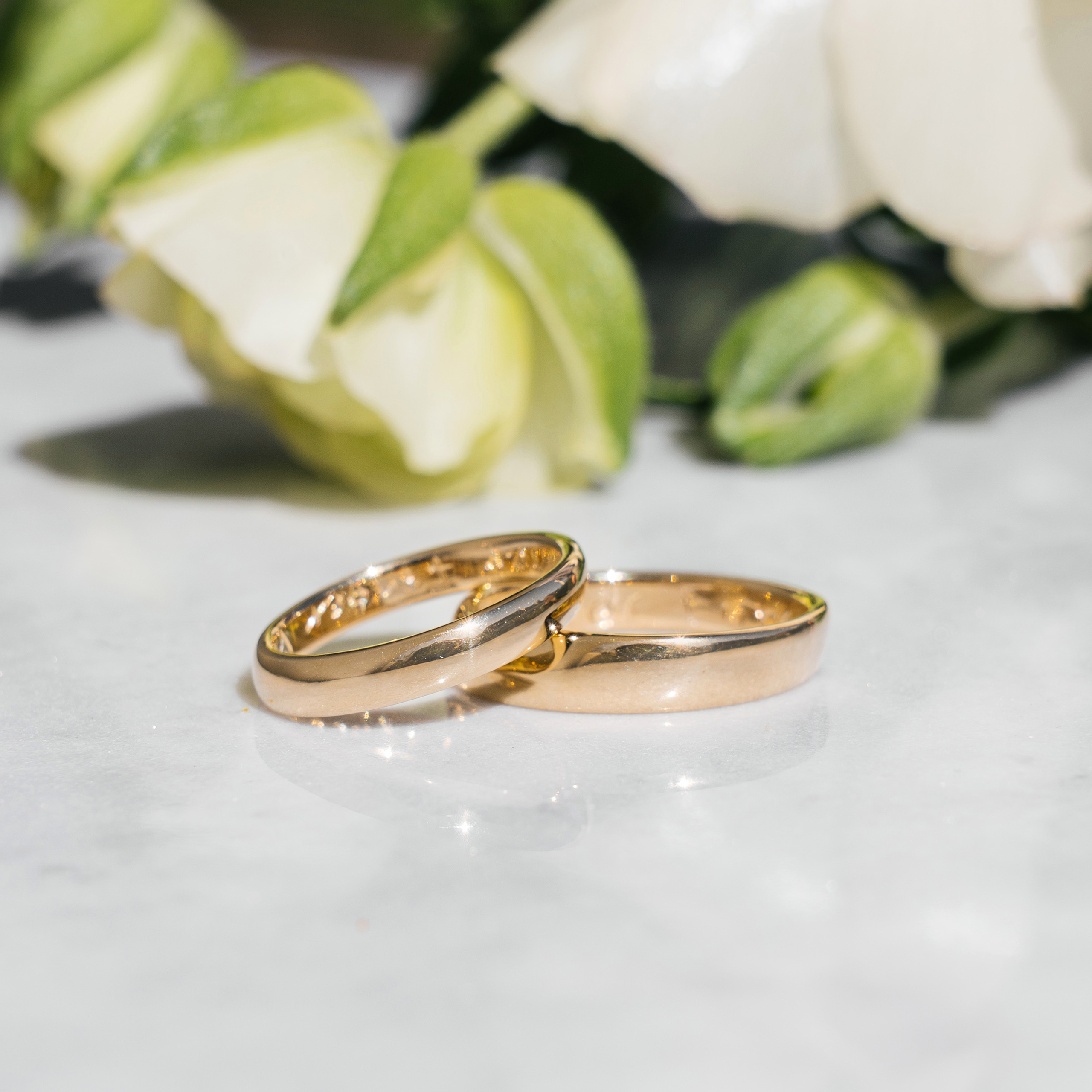 Eheringpaar Konkav aus Gelbgold mit kreismatter Oberfläche und Brillant im Damenring.